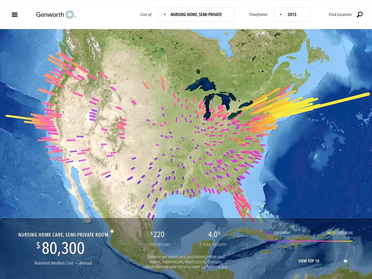 Wes was confident it wouldn’t take long to build the functionality that would allow tappable 3D visualizations. After the app was complete, users were able to zoom and tap on 500 different cities and 50 states that contained data. Once a user tapped a city, they could view a detailed screen breaking down the median cost of different long-term health care options. Users could then filter and adjust the years in order to see how much they could expect costs to rise over time. Additionally, users had the ability to compare two cities or states side-by-side. This provided more context for how locations differ in terms of cost. The app was a huge success at CES, and Genworth couldn’t believe the results in only two weeks.