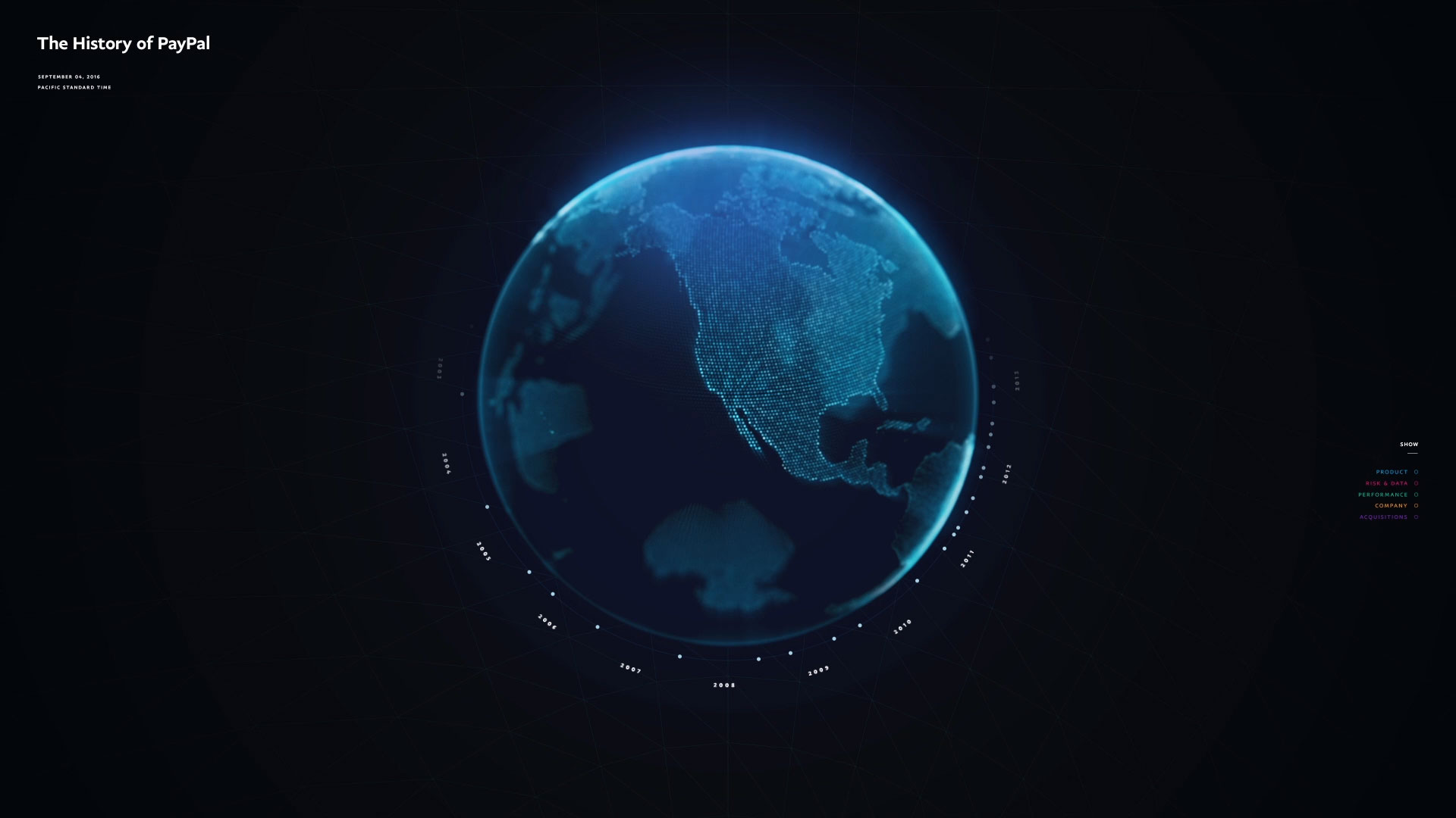 There are several reasons why a touch-installation based around a 110” grid of 4k TVs excited us. Designing an interactive 3D globe on a massive display was certainly a unique enough challenge alone. We worked with PayPal to create an exploratory mode for visitors, as well as a custom UI and story-mode that PayPal presenters could use on guided tours for their guests. Our final delivery included a deck of static designs, motion prototypes and a proof-of-concept iPad app that displayed real data on a thematically correct 3D globe. PayPal continues to challenge us with each new project they hand us, ultimately helping us set the bar higher for ourselves.